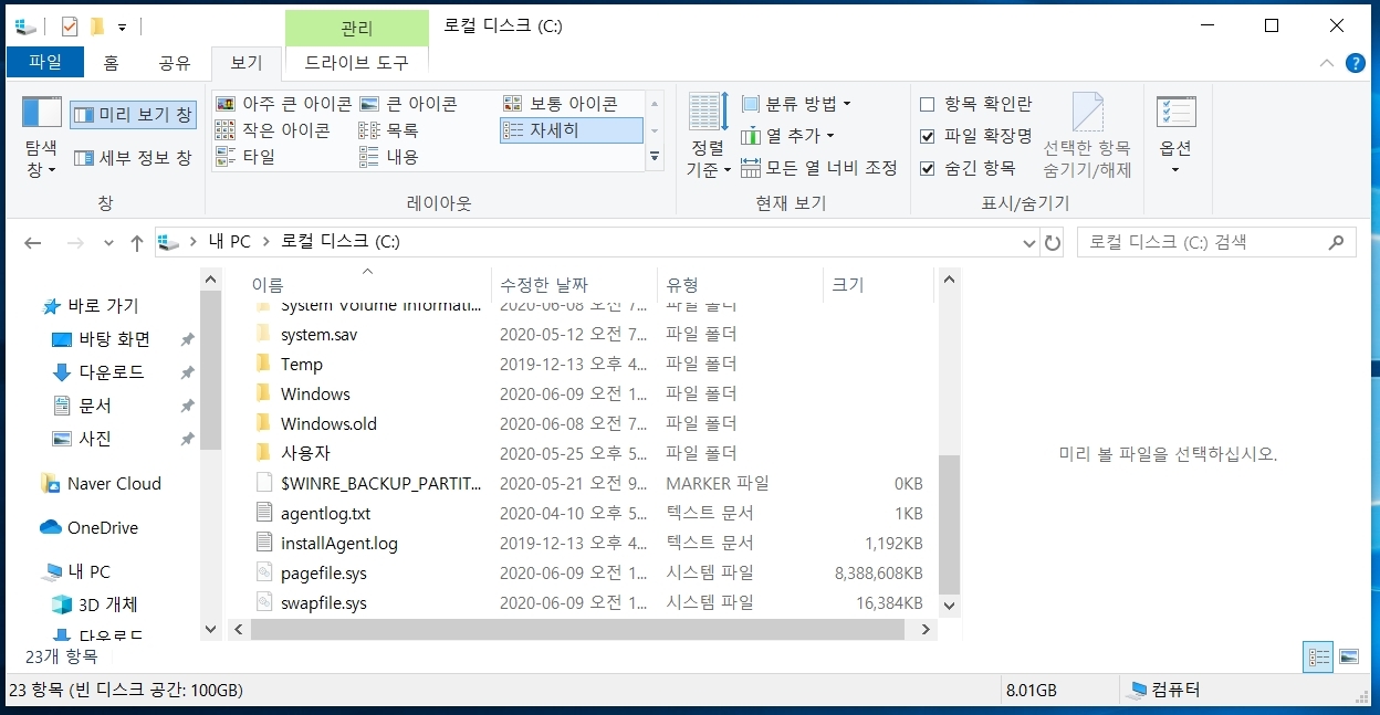본인의 pagefile.sys 파일인데요 약 8GB 용량을 차지하고 있는 것을 알 수 있습니다. 설정값에 따라 달라지기 때문에 사용자마자 해당 용량은 다르게 보입니다.