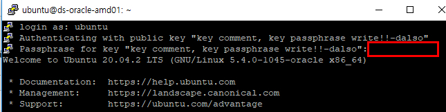 계정명은 기본 계정명 ubuntu를 입력해주시면 커맨트로 등록해주던게 나오는데