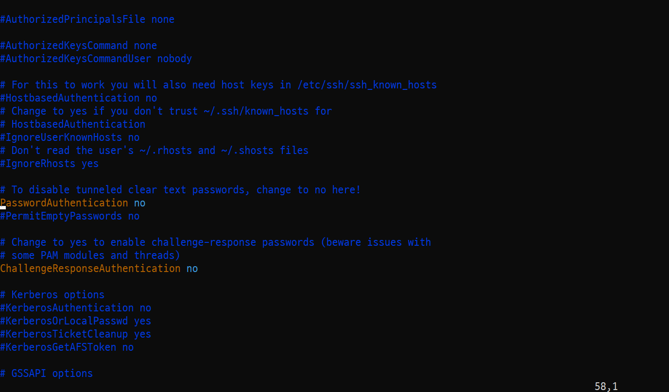 약 58번째 줄을 보면 PasswordAuthentication 이라는 항목이 보이는데, no로 되어 있는 것을 yes로 변경한다. 즉 암호 기반의 연결을 지원하도록 하는 설정이다.
