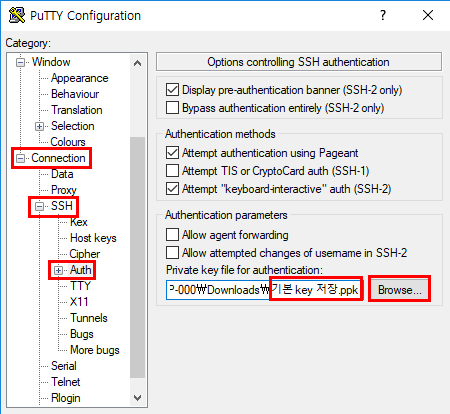Connection -> SSH -> Auth 에 .ppk 파일 업로드 후 open