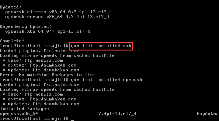 # yum list installed ssh 명령으로 ssh 설치 확인
