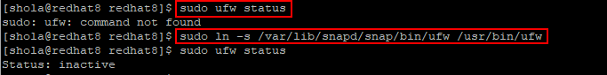 Use:If you get an error saying “ufw: command not found”, it may be a problem with the ufw paths. As a workaround, run the following command to create a symbolic link to/var/lib/snapd/snap/bin/ufwfrom/usr/bin/ufw. After that try to check the ufw status again and it should work fine.