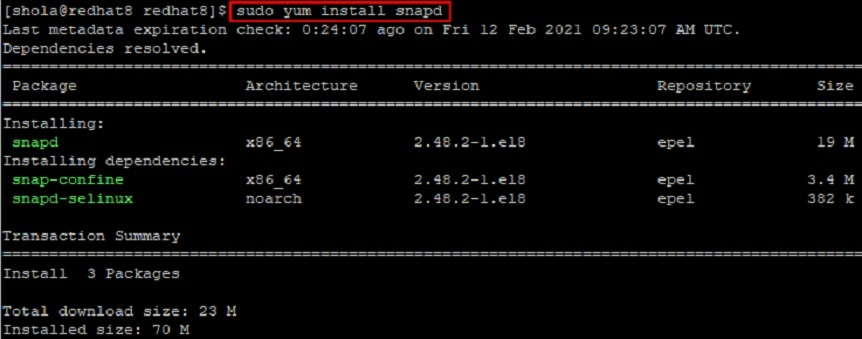 Snapd is a background process that manages snapshots. To install snapd on RHEL 8, you must first add the Additional Packages for Enterprise Linux (EPEL) repository as follows.