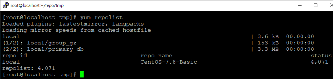 위와 같이 Local yum repository를 구성했으면 Local에 저장되어있는 yum을 사용할 수 있게 됩니다!