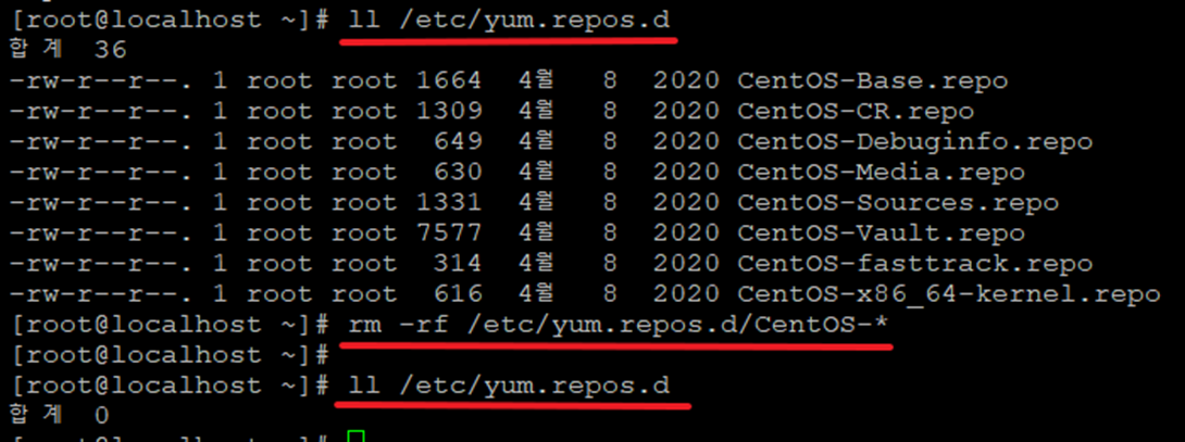 외부 통신을 사용하지 않을것이기 때문에 CentOS-7이라는 이름을 가진 Repo 파일을 전부 삭제합니다.