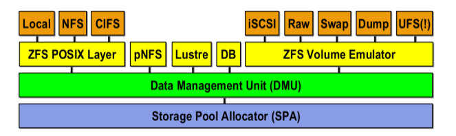 위 이미지는 ZFS 파일 시스템의 구조를 도식화 한 그림이며, 구조의 가장 하부 구성은 SPA(Storage Pool Allocator)로 ZFS 파일 시스템의 특징 중 하나인 스토리지 풀을 의미합니다. 공간할당, 체크섬, 압축 암호화 등 ZFS 파일 시스템의 특징을 제공합니다. 상위 구조로 DMU(Data Management Unit)이며, DMU 오브젝트 및 13 SPA 메타 데이터를 저장합니다. DMU 오브젝트는 사용자 데이터, 디렉토리, znode, SPA 등으로 구성되며, 오브젝트 기반이기 때문에 모듈형 확장이 가능합니다. ZFS 의 경우 inode 기반의 표준 POSIX 를 타파했으나, 사용자들을 위해 ZPL(ZFS POSIX Layer)이 vnode 로부터 들어오는 읽기와 쓰기 작업 환경을 변환하여 처리하며 DMU 에게 SPA 의 위치와 사이즈를 기록하도록 요청합니다. 또한 볼륨 에뮬레이션이 가능하며, ZVOL(ZFS Emulated Volume)은 Pool 의 공간을 RAW 디바이스로 표현할 수 있도록 하여 SWAP 이나 ZFS 파일 시스템에서 UFS 파일 시스템을 생성하여 사용할 수 있도록 합니다. 체크섬(Checksum)은 엔드 투 엔드 (endto-end) 체크섬을 사용하여 블록마다 검사하지 않고 uberblock 최상위에 일괄적으로 작성하여 데이터 기록 오류에 대하여 빠른 에러 감지와 복구가 가능합니다. uberblock 이란 스토리지 풀 전체가 트리 구조로 표현이 되어 해당 트리의 뿌리에 해당하는 단일 디스크 블록을 의미합니다.