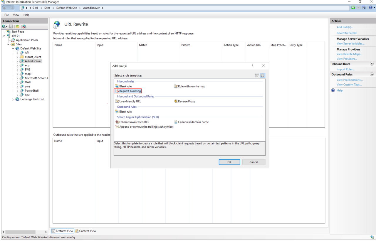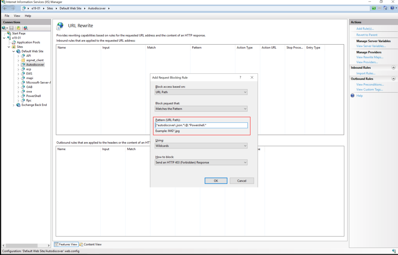 The current Exchange Server mitigation is to add a blocking rule in “IIS Manager -> Default Web Site -> URL Rewrite -> Actions” to block the known attack patterns. Exchange Server customers should review and choose only one of the following three mitigation options.