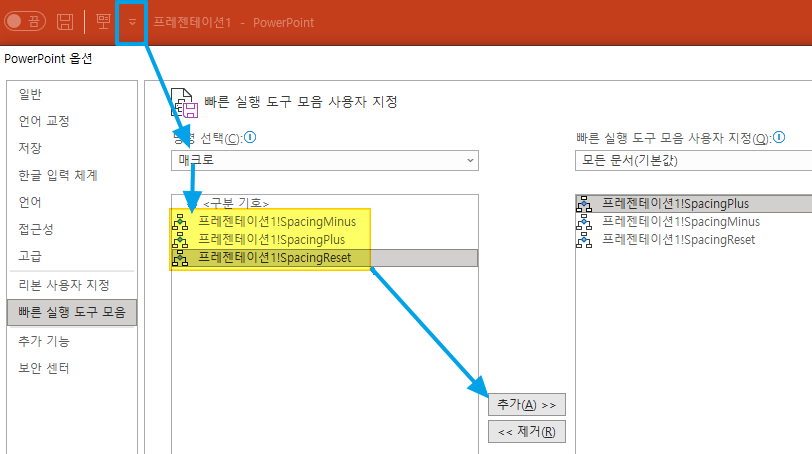 Sub SpacingPlus() Dim tr As TextRange2 Set tr = ActiveWindow.Selection.TextRange2 tr.Font.Spacing = tr.Font.Spacing + 0.1End Sub Sub SpacingMinus() Dim tr As TextRange2 Set tr = ActiveWindow.Selection.TextRange2 tr.Font.Spacing = tr.Font.Spacing - 0.1End Sub Sub SpacingReset() Dim tr As TextRange2 Set tr = ActiveWindow.Selection.TextRange2 tr.Font.Spacing = 0 End Sub1-2. 빠른실행에 매크로> 위 3가지 매크로 추가