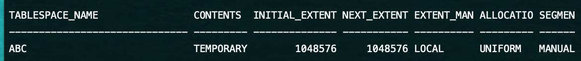 필수적인 정보만 입력하여 Tablespace를 생성해봤습니다. 종류는 PERMANENT이고 다른 옵션은 기입하지 않아 SMALL FILE로 EXTENT_MANAGEMENT는 LOCAL 그리고 SEGMENT_SPACE_MANAGEMENT는 AUTO 형태로 저장되었습니다.