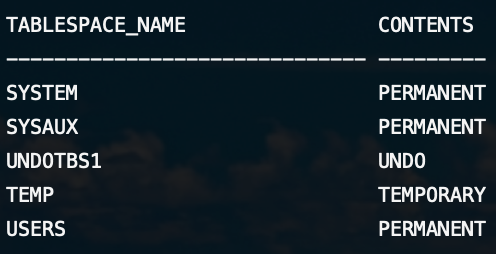 SYS@orcl> select tablespace_name, contents from dba_tablespaces;