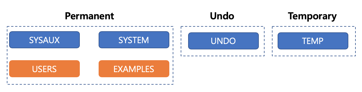 영구 테이블스페이스는 가장 일반적인 테이블스페이스로 데이터를 축적용도로 사용되는 공간입니다. Undo와 Temporary와는 다르게 고의적으로 삭제하지 않는한 영구적으로 보존되는 객체들을 저장하기 위한 용도입니다. USERS나 EXAMPLES 테이블스페이스처럼 임의의 이름을 지정하여 원하는 데이터를 저장할 수 있고 데이터베이스가 운영되기 위해 꼭 필요한 SYSTEM과 SYSAUX 테이블스페이스가 있습니다.