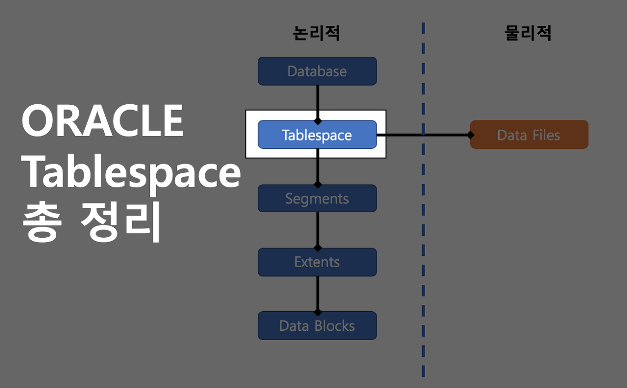 Tablespace는 하나의 데이터베이스 안에 가장 큰 논리적 저장공간으로 업무의 단위나 사용용도에 따라 여러개의 Tablespace로 분리하여 관리되고 Segment(오브젝트)라는 논리적 저장공간의 집합이기도 합니다.