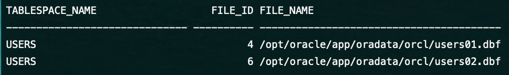 select tablespace_name, file_id, file_name from dba_data_files where tablespace_name = 'USERS';