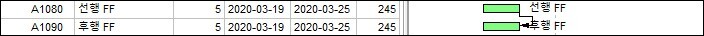 Finish to Finish(FF) 선행 작업의 종료와 후행 작업의 종료가 동시에 종료되는 관계이다.