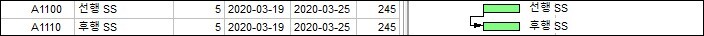Start to Start(SS) 선행 작업의 시작과 후행 작업의 시작이 동시에 시작되는 관계이다.