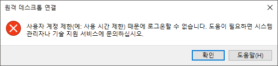 Windows10 원격 데스크탑 연결시 아래와 같이 '사용자 계정 제한(예: 사용 시간 제한) 때문에 로그인할 수 없습니다. 도움이 필요하면 시스템 관리자나 기술 지원 서비스에 문의하십시오.' 오류가 발생한다.