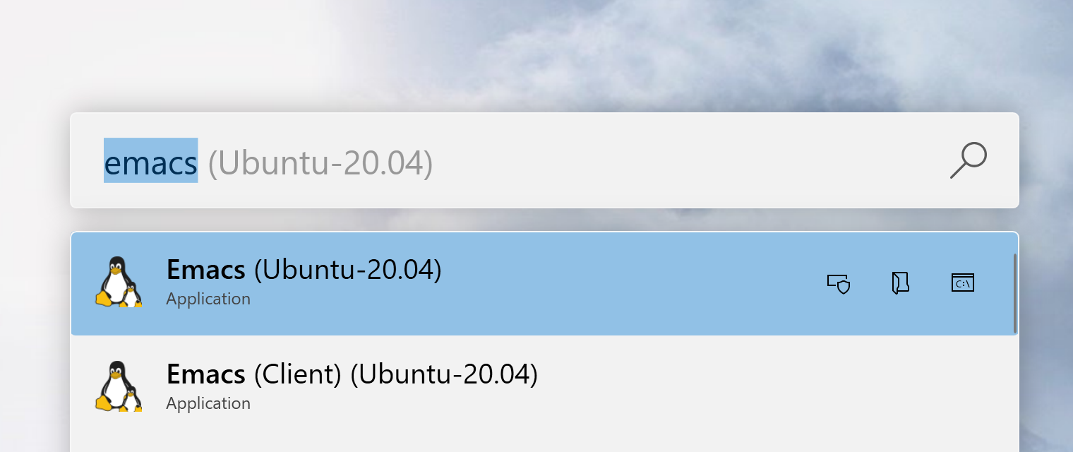For some reason with the default emacs.desktop (installed by make install in /usr/local/share/applications/) Emacs’s icon got replaced with a generic Linux icon in Windows, but I have been unable to figure out what exactly went wrong. I’ll update the article when I figure this out.