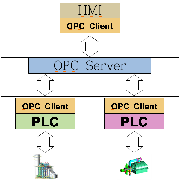 제어 장비들을 OPC 통신을 통해 서버와 연결한 다음, 통신이 필요한 장치 내부 태그를 서버에 등록하면 사용자는 원하는 제어나 데이터를 서버에 접속하여 사용하는형태다. 유지와 보수 또한 태그들이 등록된 서버만 관리하면 되니 운영도 매우 간단해진다. HMI 환경은 다른 장비와 동일한 OPC 클라이언트 구조로 되어 있지만 OPC 서버를 HMI가 관리하게 함으로 사용자에게 좀 더 편의성을 제공한다.