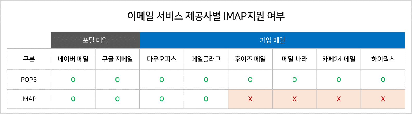 1) 이메일 서비스 제공사별 IMAP지원 여부