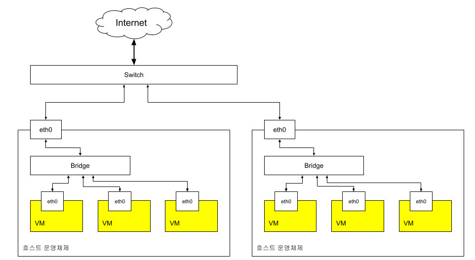 - 물리적인 환경에서는 물리적인 네트워크 스위치로 서로 연결이 되지만, 호스트 운영체제 내부에 물리적인 네트워크를 둘 수 없으니, 게스트 OS들을 연결하기 위한 가상의 네트워크를 구성함.