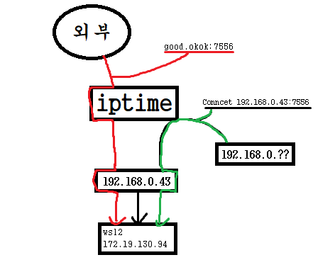 그럼 우리는 외부와 내부에서는 포트포워딩으로 7556 포트로 오는 접속시도는 192.168.0.43 으로 정상적으로 보냈으나 사실은 192.168.0.43이 그걸 받으면 안되고 그림에서 보이는 ip인 172.19.130.94가 이 ip를 받아야 하는것이다.